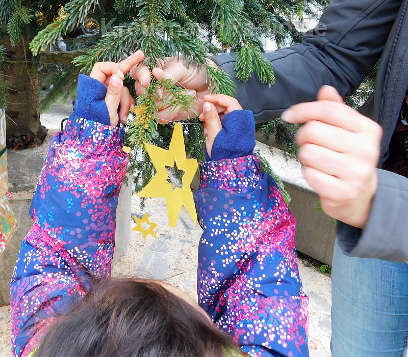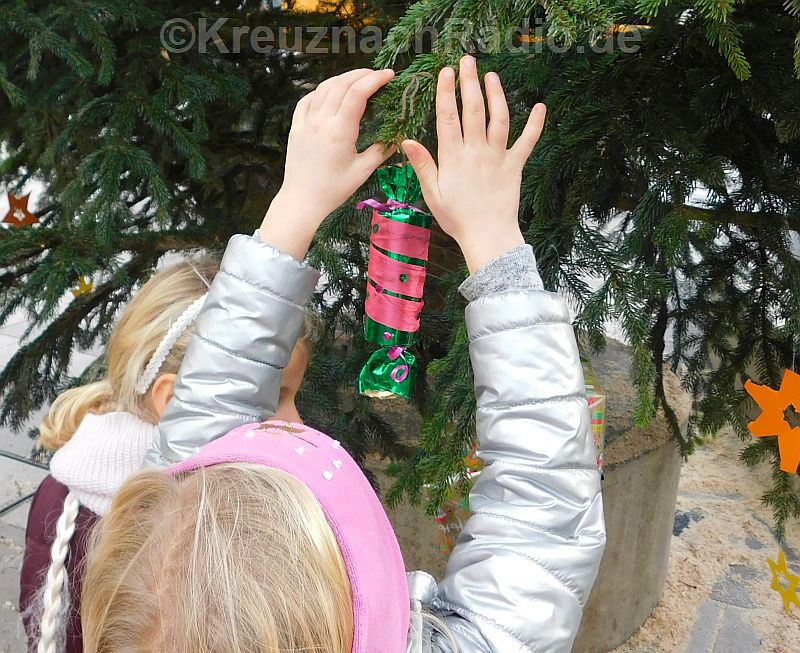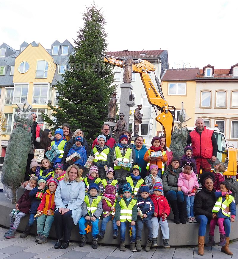 Tradition hat es inzwischen, dass der Forstbetrieb Zimmermann Tannen auch den Kindergärten spendet. Erstmals erfolgte die Übergabe auf dem jetzt neu gestalteten Kornmarkt. Den großen Weihnachtsbaum schmückten die Mädchen und Jungen mit selbstgebastelten Sternen und Geschenkeattrappen.