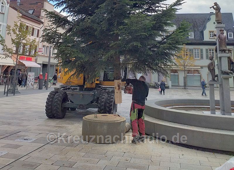 BAD KREUZNACH (28.11.19). Rund 25 Jahre alt ist die etwa neuneinhalb Meter hohe Nordmanntanne aus dem Forst bei Sponheim, die seit heute auf dem Kornmarkt steht.